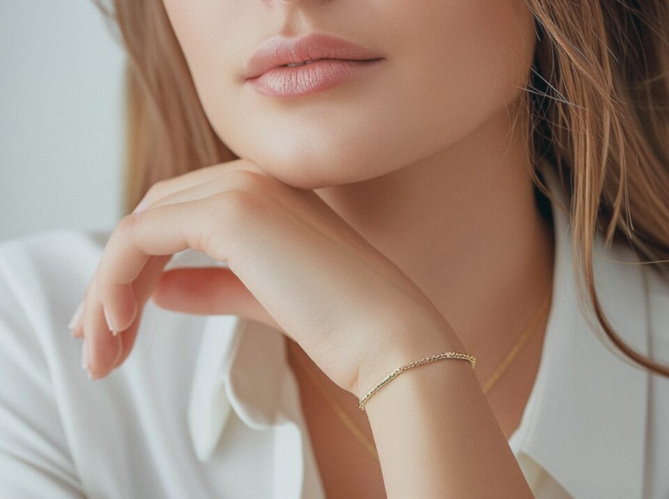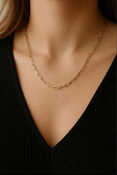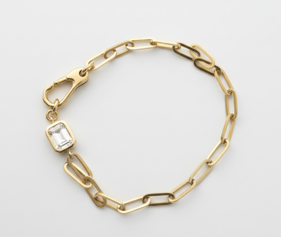 This modern 14k gold bracelet combines the popular paperclip link trend with classic luxury. It features a prominent emerald-cut clear stone set in a sleek gold bezel, finished with a stylish oversized lobster clasp that serves as both a secure closure and a design element.