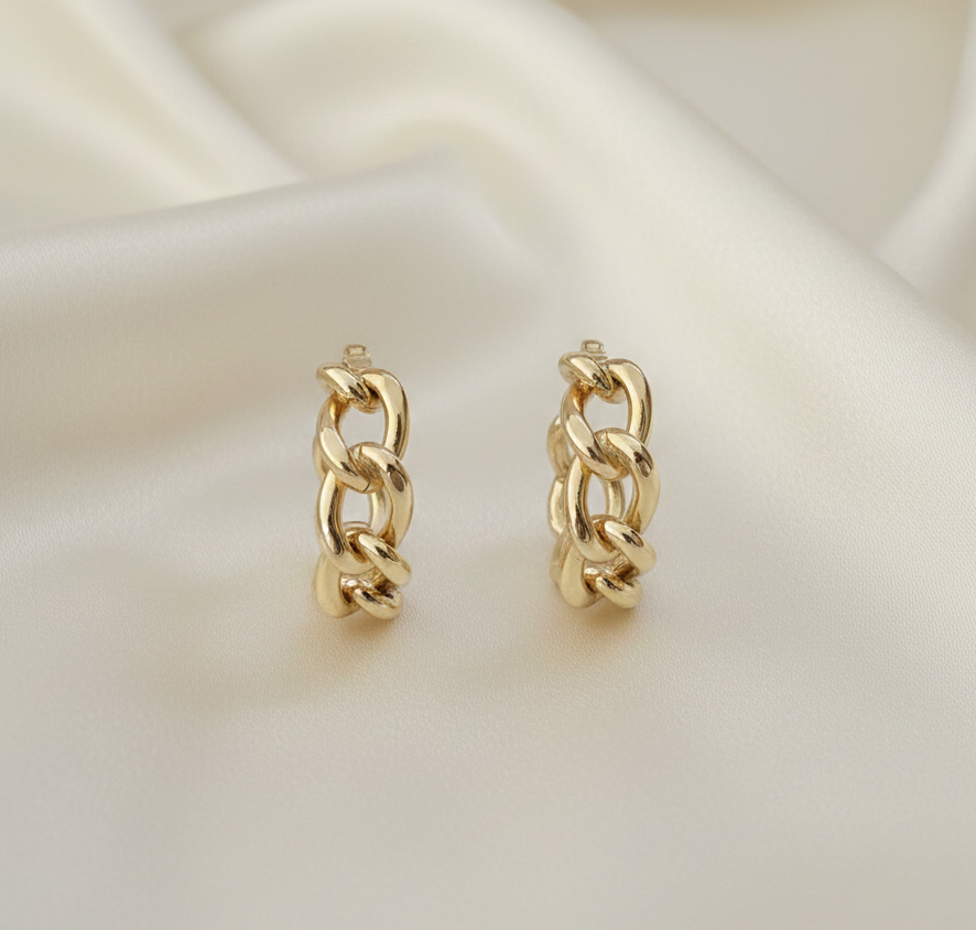Bold and trendy, these 14k gold hoop earrings showcase a classic Cuban link design. The high-polish finish highlights the interconnected links, creating a textured and voluminous look that adds a modern edge to any outfit.