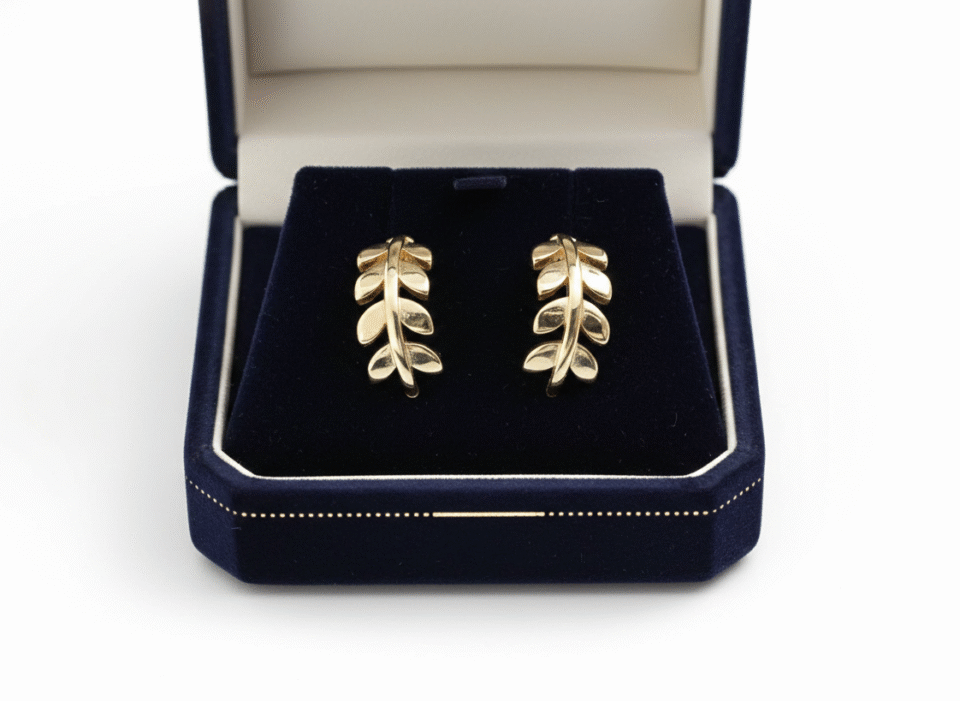 Symbolizing victory and peace, these 14k gold stud earrings feature a beautifully detailed laurel leaf design. The polished finish enhances the delicate texture of the foliage, offering a nature-inspired look that is both elegant and meaningful.