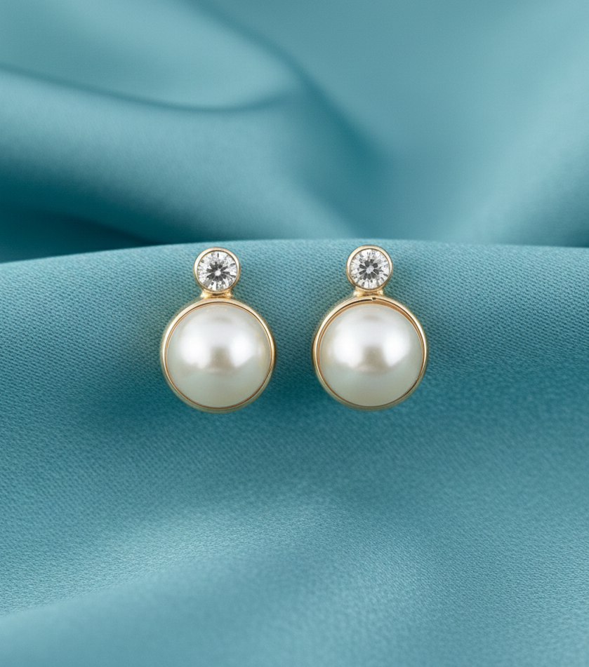 A perfect blend of classic elegance and modern sparkle. These 14k gold earrings feature a lustrous round pearl suspended beneath a shimmering bezel-set stone. Their refined design makes them an ideal choice for bridal wear or elevating everyday attire.