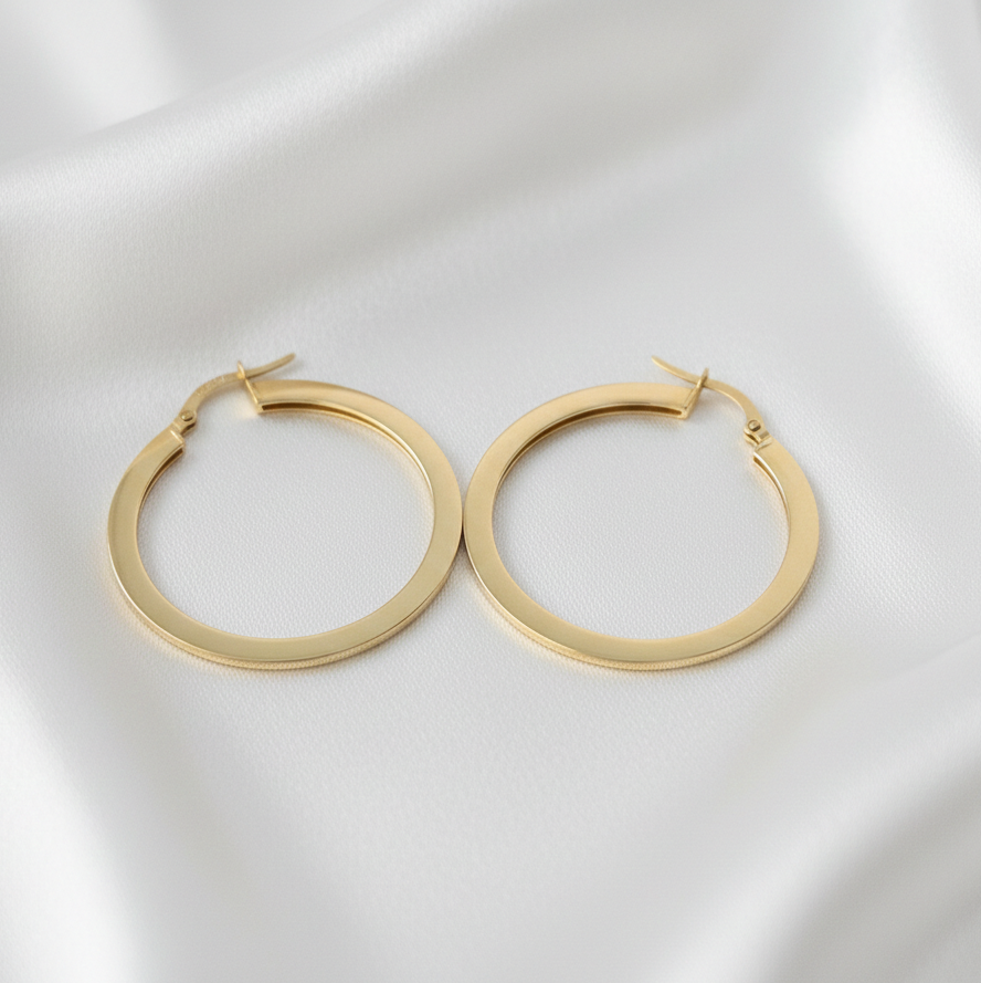 A contemporary twist on the traditional hoop. These 14k gold earrings feature a distinct flat-edge profile, offering a sleek and architectural look. Their wide surface area reflects light beautifully while remaining lightweight for comfortable all-day wear.