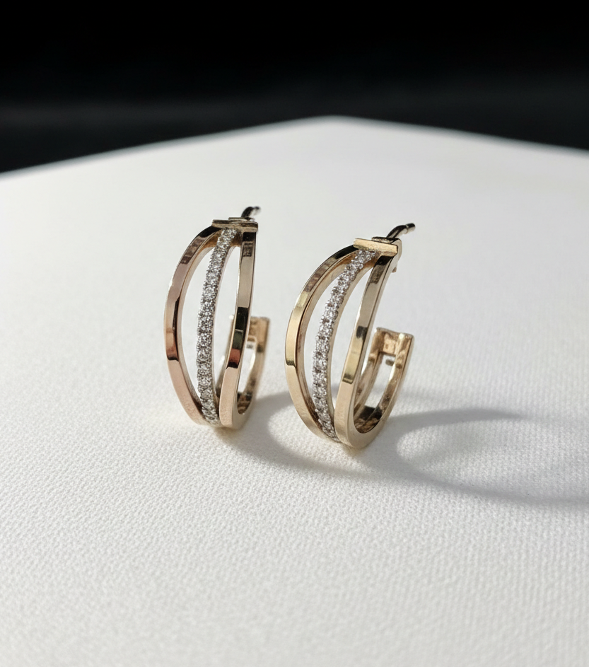 Exquisitely crafted in 14k gold, these modern hoop earrings feature a sophisticated triple-band design. The center band is meticulously pavé-set with shimmering diamond accents, flanked by two polished gold bands for a balanced, luxurious look.